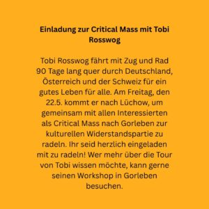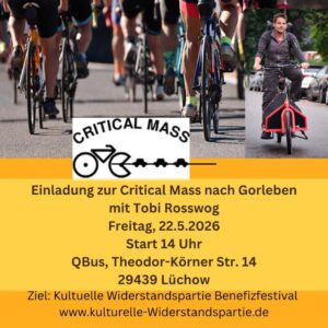 Die Kulturelle Widerstandspartie findet seit 2015 jährlich (mit Ausnahme der Pandemie) am Freitag vor Pfingsten an den Atomanlagen in Gorleben statt. Sie setzt während der Kulturellen Landpartie im Wendland, dem größten selbstorganisierten Kulturfestival Norddeutschlands, einen ganz wichtigen politischen Fokus.